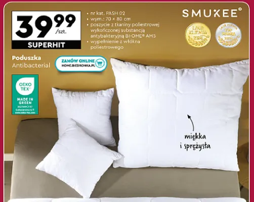 Cena produktu r贸偶ni si臋 w zale偶no艣ci od wybranego sklepu. Produkt Poduszka antibacterial 70 x 80 cm Smukee home mo偶esz kupi膰 w promocji ju偶 od 54,9 z艂. Najta艅sza oferta, jak膮 mamy w naszej bazie jest z sieci Biedronka Home. Poduszka antibacterial 70 x 80 cm Smukee home kosztuje aktualnie 54,9 z艂. Zobacz ofert臋