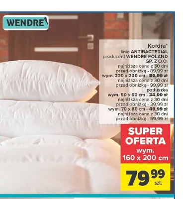 Cena produktu r贸偶ni si臋 w zale偶no艣ci od wybranego sklepu. Produkt Poduszka antybacterial 70 x 80 cm Wendre mo偶esz kupi膰 w promocji ju偶 od 54,9 z艂. Najta艅sza oferta, jak膮 mamy w naszej bazie jest z sieci Biedronka Home. Poduszka antybacterial 70 x 80 cm Wendre kosztuje aktualnie 54,9 z艂. Zobacz ofert臋