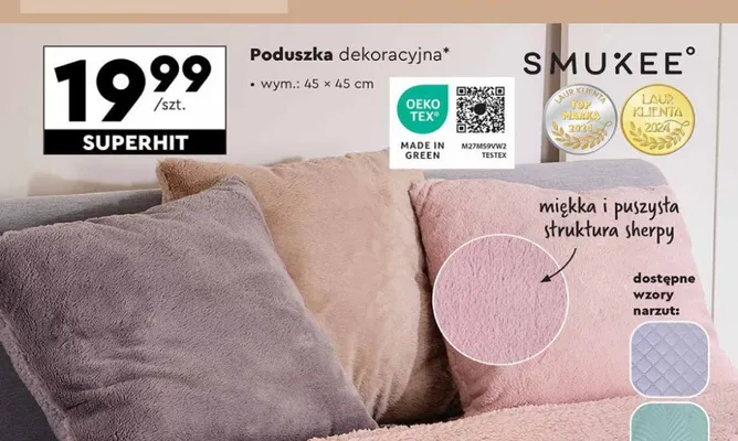 Cena produktu r贸偶ni si臋 w zale偶no艣ci od wybranego sklepu. Produkt Poduszka dekoracyjna 45 x 45 cm Smukee home mo偶esz kupi膰 w promocji ju偶 od 16,9 z艂. Najta艅sza oferta, jak膮 mamy w naszej bazie jest z sieci Selgros. Poduszka dekoracyjna 45 x 45 cm Smukee home kosztuje aktualnie 16,9 z艂. Zobacz ofert臋