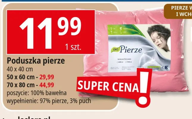 Cena produktu r贸偶ni si臋 w zale偶no艣ci od wybranego sklepu. Produkt Poduszka eko pierze 40 x 40 cm mo偶esz kupi膰 w promocji ju偶 od 4,99 z艂 do 11,99 z艂. Najta艅sza oferta, jak膮 mamy w naszej bazie jest z sieci Biedronka. Poduszka eko pierze 40 x 40 cm kosztuje aktualnie 4,99 z艂. Zobacz ofert臋