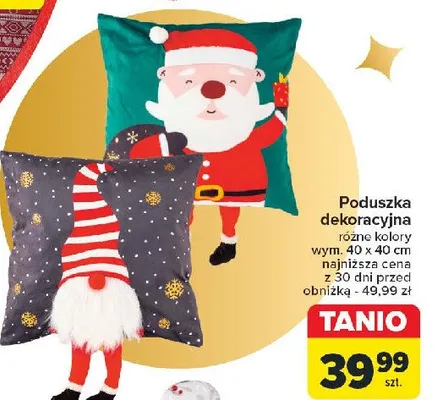 Cena produktu r贸偶ni si臋 w zale偶no艣ci od wybranego sklepu. Niestety nie posiadamy danych o aktualnych promocjach, jednak w艣r贸d archiwalnych ofert Poduszka z motywem 艣wi膮tecznym 40 x 40 cm kosztuje od 39,99 z艂.