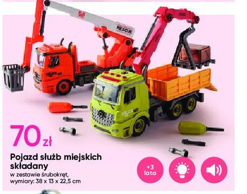 Cena produktu różni się w zależności od wybranego sklepu. Niestety nie posiadamy danych o aktualnych promocjach, jednak wśród archiwalnych ofert Pojazd służb miejskich składany kosztuje od 70 zł.