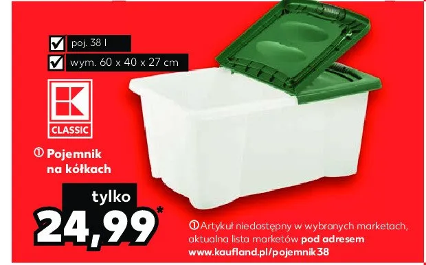 Zastanawiasz si臋, gdzie kupi膰 i ile kosztuje produkt Pojemnik na k贸艂kach 38 l K-classic? Regularnie sprawdzamy, czy jest promocja na ten produkt w Biedronka, Lidl, Kaufland, Auchan, Netto, Makro i innych sklepach. Aktualnie nie posiadamy ofert promocyjnych na ten produkt.