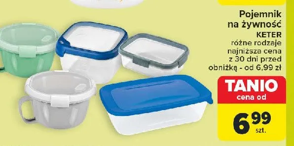 Cena produktu różni się w zależności od wybranego sklepu. Niestety nie posiadamy danych o aktualnych promocjach, jednak wśród archiwalnych ofert Pojemnik na żywnośc Keter kosztuje od 3,99 zł do 6,99 zł.