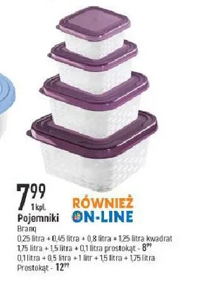 Cena produktu r贸偶ni si臋 w zale偶no艣ci od wybranego sklepu i obowi膮zuj膮cych promocji. Aktualnie w naszej bazie nie mamy informacji o cenach produktu Pojemniki 100 ml + 500 ml + 1 l + 1.5 l + 1.75 l Branq.