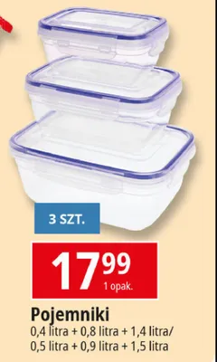 Cena produktu różni się w zależności od wybranego sklepu. Niestety nie posiadamy danych o aktualnych promocjach, jednak wśród archiwalnych ofert Pojemniki do żywności: 500 ml + 900 ml + 1.5 l kosztuje od 17,99 zł.