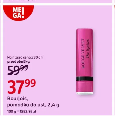 Cena produktu r贸偶ni si臋 w zale偶no艣ci od wybranego sklepu. Niestety nie posiadamy danych o aktualnych promocjach, jednak w艣r贸d archiwalnych ofert Pomadka do ust Bourjois rouge velvet lipstick kosztuje od 24,99 z艂 do 37,99 z艂.