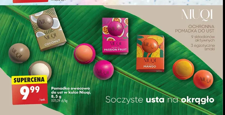 Cena produktu r贸偶ni si臋 w zale偶no艣ci od wybranego sklepu. Niestety nie posiadamy danych o aktualnych promocjach, jednak w艣r贸d archiwalnych ofert Pomadka do ust w kulce passion fruit Niuqi kosztuje od 9,99 z艂.