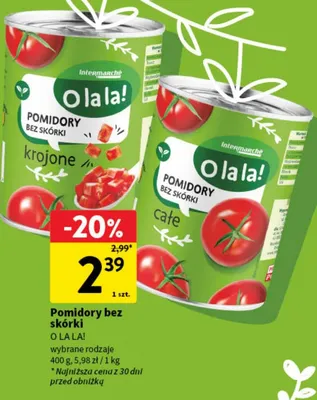 Cena produktu r贸偶ni si臋 w zale偶no艣ci od wybranego sklepu. Niestety nie posiadamy danych o aktualnych promocjach, jednak w艣r贸d archiwalnych ofert Pomidory ca艂e O la la! kosztuje od 2,39 z艂.