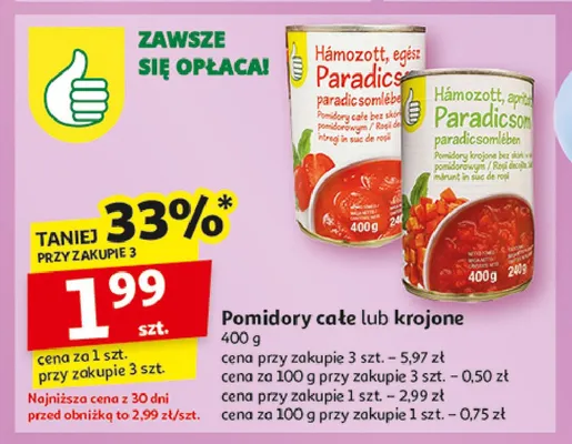 Cena produktu r贸偶ni si臋 w zale偶no艣ci od wybranego sklepu. Niestety nie posiadamy danych o aktualnych promocjach, jednak w艣r贸d archiwalnych ofert Pomidory ca艂e Podniesiony kciuk kosztuje od 1,99 z艂 do 2,99 z艂.