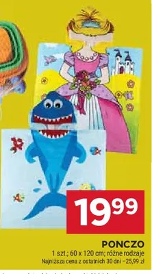 Cena produktu r贸偶ni si臋 w zale偶no艣ci od wybranego sklepu. Niestety nie posiadamy danych o aktualnych promocjach, jednak w艣r贸d archiwalnych ofert Poncho dzieci臋ce 60 x 120 cm kosztuje od 19,99 z艂 do 39,99 z艂.