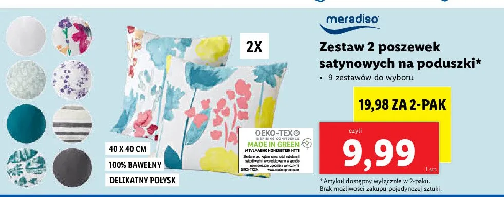 Zastanawiasz si臋, gdzie kupi膰 i ile kosztuje produkt Poszewki na poduszki satynowe 40 x 40 cm Meradiso? Regularnie sprawdzamy, czy jest promocja na ten produkt w Biedronka, Lidl, Kaufland, Auchan, Netto, Makro i innych sklepach. Aktualnie nie posiadamy ofert promocyjnych na ten produkt.