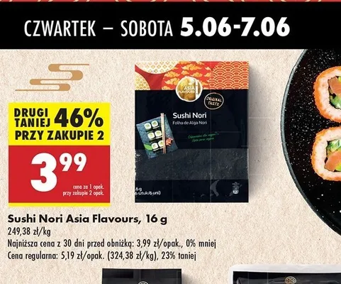 Cena produktu różni się w zależności od wybranego sklepu. Niestety nie posiadamy danych o aktualnych promocjach, jednak wśród archiwalnych ofert Prażone liście alg morskich sushi nori Asia flavours kosztuje od 3,99 zł do 4,59 zł.