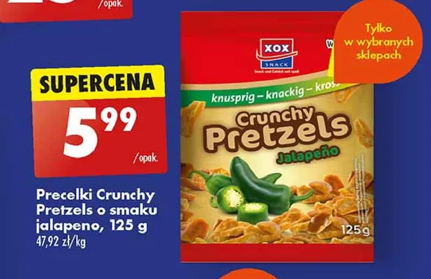 Cena produktu r贸偶ni si臋 w zale偶no艣ci od wybranego sklepu. Niestety nie posiadamy danych o aktualnych promocjach, jednak w艣r贸d archiwalnych ofert Precelki o smaku jalapeno XOX SNACK kosztuje od 5,99 z艂.