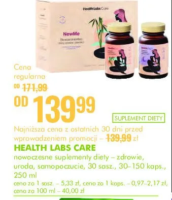 Cena produktu r贸偶ni si臋 w zale偶no艣ci od wybranego sklepu. Niestety nie posiadamy danych o aktualnych promocjach, jednak w艣r贸d archiwalnych ofert Preparat na w艂osy sk贸r臋 i paznokcie Health labs care new me kosztuje od 139,99 z艂.