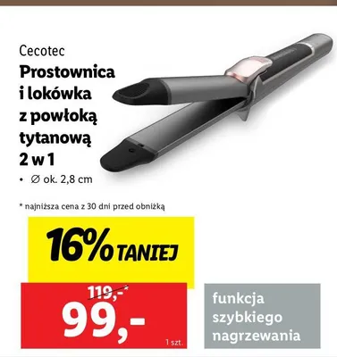 Cena produktu różni się w zależności od wybranego sklepu. Niestety nie posiadamy danych o aktualnych promocjach, jednak wśród archiwalnych ofert Prostownica i lokówka z powłoką tytanową 2w1 CECOTEC kosztuje od 99 zł do 119 zł.