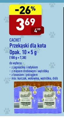 Cena produktu różni się w zależności od wybranego sklepu. Niestety nie posiadamy danych o aktualnych promocjach, jednak wśród archiwalnych ofert Przekąski mix kurczak-wołowina-wątróbka-drób Cachet kosztuje od 3,69 zł.