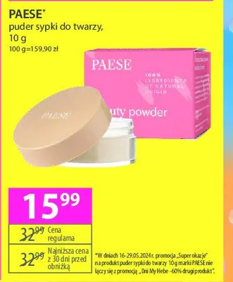 Cena produktu r贸偶ni si臋 w zale偶no艣ci od wybranego sklepu. Niestety nie posiadamy danych o aktualnych promocjach, jednak w艣r贸d archiwalnych ofert Puder sypki ry偶owy Paese kosztuje od 14,99 z艂 do 17,49 z艂.