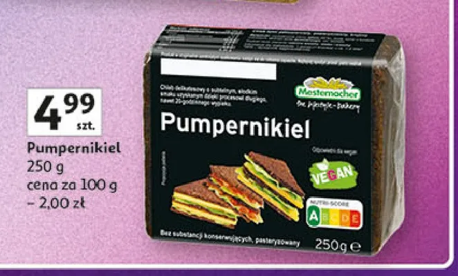 Zastanawiasz si臋, gdzie kupi膰 i ile kosztuje produkt Pumperiniel Mestemacher? Regularnie sprawdzamy, czy jest promocja na ten produkt w Biedronka, Lidl, Kaufland, Auchan, Netto, Makro i innych sklepach. Aktualnie posiadamy 1 ofert臋 promocyjn膮 na ten produkt. Ceny zaczynaj膮 si臋 od 7,34z艂!