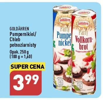 Cena produktu r贸偶ni si臋 w zale偶no艣ci od wybranego sklepu. Niestety nie posiadamy danych o aktualnych promocjach, jednak w艣r贸d archiwalnych ofert Pumpernikiel Goldahren kosztuje od 3,49 z艂 do 3,99 z艂.