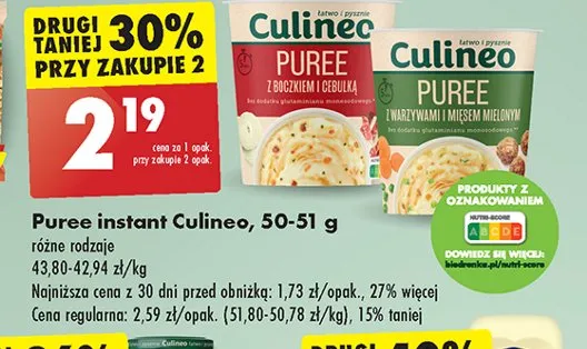 Cena produktu r贸偶ni si臋 w zale偶no艣ci od wybranego sklepu. Niestety nie posiadamy danych o aktualnych promocjach, jednak w艣r贸d archiwalnych ofert Puree z boczkiem i cebulk膮 Culineo kosztuje od 1,49 z艂 do 2,19 z艂.