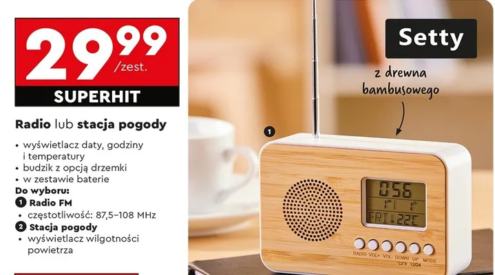 Cena produktu r贸偶ni si臋 w zale偶no艣ci od wybranego sklepu. Produkt Radio fm Setty mo偶esz kupi膰 w promocji ju偶 od 79,9 z艂. Najta艅sza oferta, jak膮 mamy w naszej bazie jest z sieci Biedronka. Radio fm Setty kosztuje aktualnie 79,9 z艂. Zobacz ofert臋