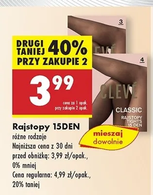 Cena produktu r贸偶ni si臋 w zale偶no艣ci od wybranego sklepu. Niestety nie posiadamy danych o aktualnych promocjach, jednak w艣r贸d archiwalnych ofert Rajstopy classic 15 den Cleve kosztuje od 3,99 z艂.