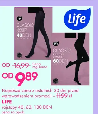 Cena produktu r贸偶ni si臋 w zale偶no艣ci od wybranego sklepu. Niestety nie posiadamy danych o aktualnych promocjach, jednak w艣r贸d archiwalnych ofert Rajstopy damskie classic 60 den nero Life (super-pharm) kosztuje od 9,89 z艂.