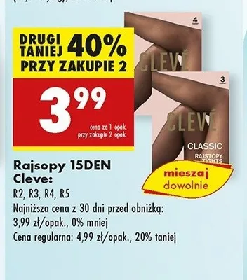 Cena produktu r贸偶ni si臋 w zale偶no艣ci od wybranego sklepu. Niestety nie posiadamy danych o aktualnych promocjach, jednak w艣r贸d archiwalnych ofert Rajstopy damskie classic Cleve kosztuje od 3,99 z艂 do 14,99 z艂.