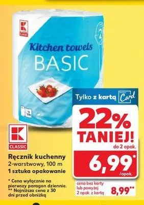 Cena produktu r贸偶ni si臋 w zale偶no艣ci od wybranego sklepu. Produkt R臋cznik kuchenny basic K-classic mo偶esz kupi膰 w promocji ju偶 od 4,99 z艂. Najta艅sza oferta, jak膮 mamy w naszej bazie jest z sieci Rossmann. R臋cznik kuchenny basic K-classic kosztuje aktualnie 4,99 z艂. Zobacz ofert臋
