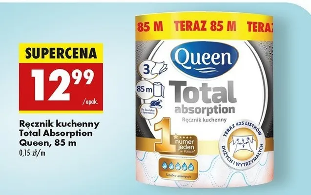 Cena produktu r贸偶ni si臋 w zale偶no艣ci od wybranego sklepu. Niestety nie posiadamy danych o aktualnych promocjach, jednak w艣r贸d archiwalnych ofert R臋cznik kuchenny total absorption 85 m Queen kosztuje od 11,99 z艂 do 12,99 z艂.