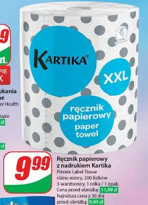 Cena produktu r贸偶ni si臋 w zale偶no艣ci od wybranego sklepu. Produkt R臋cznik papierowy xxl Kartika mo偶esz kupi膰 w promocji ju偶 od 7,29 z艂 do 15 z艂. Najta艅sza oferta, jak膮 mamy w naszej bazie jest z sieci Chorten. R臋cznik papierowy xxl Kartika kosztuje aktualnie 7,29 z艂. Zobacz ofert臋