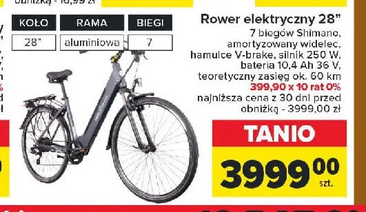 Cena produktu r贸偶ni si臋 w zale偶no艣ci od wybranego sklepu. Niestety nie posiadamy danych o aktualnych promocjach, jednak w艣r贸d archiwalnych ofert Rower aluminiowy elektryczny 28" kosztuje od 3999 z艂.