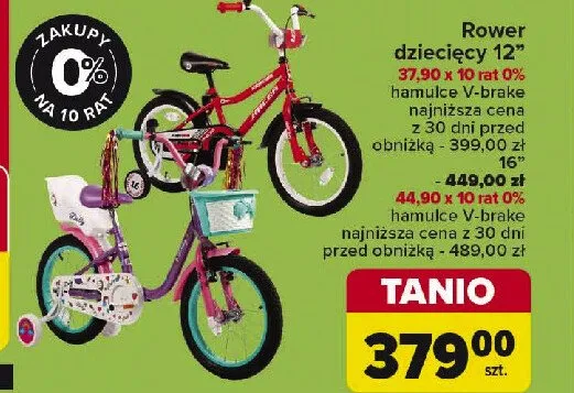 Cena produktu r贸偶ni si臋 w zale偶no艣ci od wybranego sklepu. Produkt Rower dzieci臋cy 16'' mo偶esz kupi膰 w promocji ju偶 od 429 z艂 do 599 z艂. Najta艅sza oferta, jak膮 mamy w naszej bazie jest z sieci Carrefour. Rower dzieci臋cy 16'' kosztuje aktualnie 429 z艂. Zobacz ofert臋