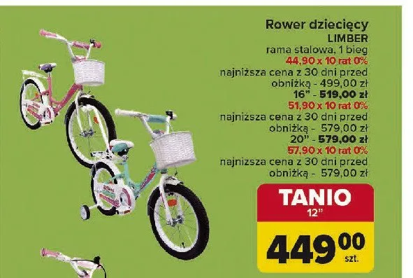 Cena produktu r贸偶ni si臋 w zale偶no艣ci od wybranego sklepu. Produkt Rower dzieci臋cy 16" LIMBER mo偶esz kupi膰 w promocji ju偶 od 489 z艂. Najta艅sza oferta, jak膮 mamy w naszej bazie jest z sieci Carrefour. Rower dzieci臋cy 16" LIMBER kosztuje aktualnie 489 z艂. Zobacz ofert臋
