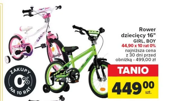 Cena produktu r贸偶ni si臋 w zale偶no艣ci od wybranego sklepu. Produkt Rower dziewcz臋cy 16" mo偶esz kupi膰 w promocji ju偶 od 449 z艂 do 549 z艂. Najta艅sza oferta, jak膮 mamy w naszej bazie jest z sieci Carrefour. Rower dziewcz臋cy 16" kosztuje aktualnie 449 z艂. Zobacz ofert臋