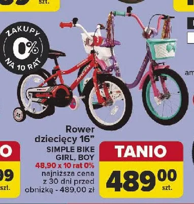 Cena produktu r贸偶ni si臋 w zale偶no艣ci od wybranego sklepu. Niestety nie posiadamy danych o aktualnych promocjach, jednak w艣r贸d archiwalnych ofert Rower simple bike 16" boy KIMET kosztuje od 489 z艂.