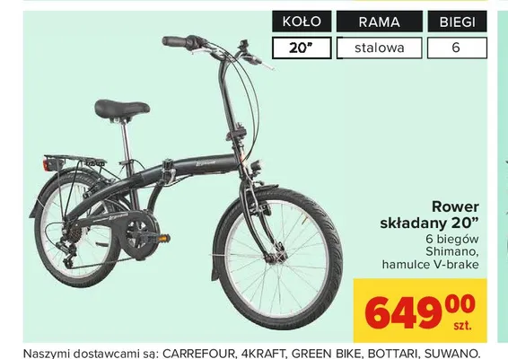Cena produktu r贸偶ni si臋 w zale偶no艣ci od wybranego sklepu. Niestety nie posiadamy danych o aktualnych promocjach, jednak w艣r贸d archiwalnych ofert Rower sk艂adany 20" 6 bieg贸w kosztuje od 649 z艂 do 699 z艂.