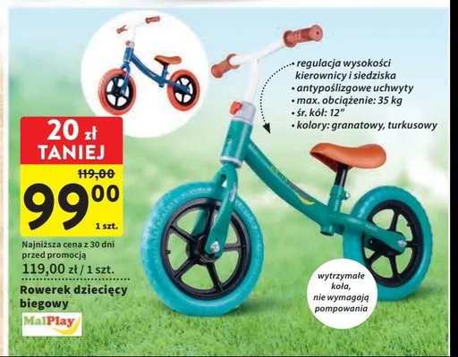 Zastanawiasz si臋, gdzie kupi膰 i ile kosztuje produkt Rowerek biegowy zielony Malplay? Regularnie sprawdzamy, czy jest promocja na ten produkt w Biedronka, Lidl, Kaufland, Auchan, Netto, Makro i innych sklepach. Aktualnie nie posiadamy ofert promocyjnych na ten produkt.