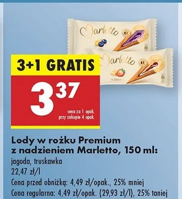 Cena produktu różni się w zależności od wybranego sklepu. Niestety nie posiadamy danych o aktualnych promocjach, jednak wśród archiwalnych ofert Rożek z belgijską czekoladą jagoda Marletto kosztuje od 2,99 zł do 3,37 zł.