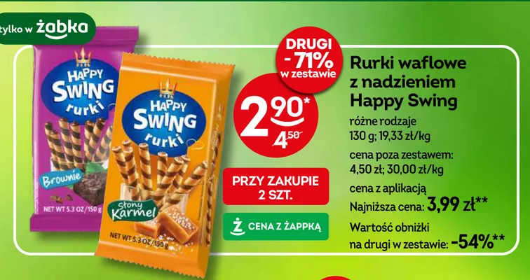 Cena produktu r贸偶ni si臋 w zale偶no艣ci od wybranego sklepu. Niestety nie posiadamy danych o aktualnych promocjach, jednak w艣r贸d archiwalnych ofert Rurki brownie Happy swing kosztuje od 2,9 z艂.