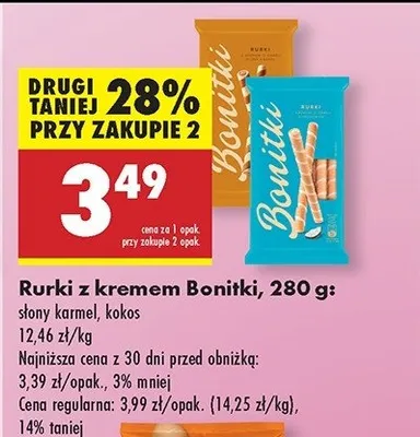 Cena produktu r贸偶ni si臋 w zale偶no艣ci od wybranego sklepu. Niestety nie posiadamy danych o aktualnych promocjach, jednak w艣r贸d archiwalnych ofert Rurki z kremem kokos Bonitki kosztuje od 2,99 z艂 do 3,49 z艂.