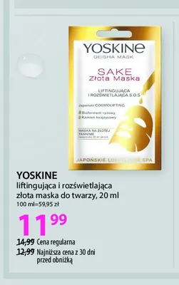 Cena produktu r贸偶ni si臋 w zale偶no艣ci od wybranego sklepu. Niestety nie posiadamy danych o aktualnych promocjach, jednak w艣r贸d archiwalnych ofert Sake z艂ota maska Yoskine geisha mask kosztuje od 9,39 z艂 do 11,99 z艂.