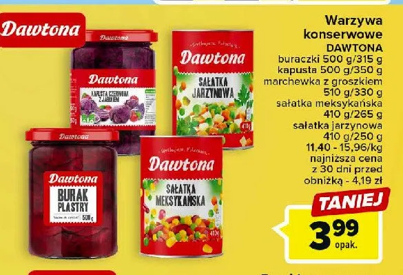 Cena produktu r贸偶ni si臋 w zale偶no艣ci od wybranego sklepu. Niestety nie posiadamy danych o aktualnych promocjach, jednak w艣r贸d archiwalnych ofert Sa艂atka jarzynowa Dawtona kosztuje od 2,99 z艂 do 4,27 z艂.