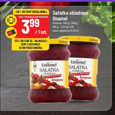 Cena produktu r贸偶ni si臋 w zale偶no艣ci od wybranego sklepu. Niestety nie posiadamy danych o aktualnych promocjach, jednak w艣r贸d archiwalnych ofert Sa艂atka obiadowa UNAMEL kosztuje od 3,99 z艂.