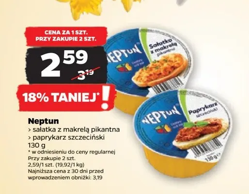 Cena produktu r贸偶ni si臋 w zale偶no艣ci od wybranego sklepu. Niestety nie posiadamy danych o aktualnych promocjach, jednak w艣r贸d archiwalnych ofert Sa艂atka z makreli pikantna Neptun kosztuje od 1,99 z艂 do 3,19 z艂.