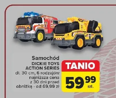 Cena produktu różni się w zależności od wybranego sklepu. Niestety nie posiadamy danych o aktualnych promocjach, jednak wśród archiwalnych ofert Samochód action series - straż pożarna Dickie toys kosztuje od 59,99 zł.