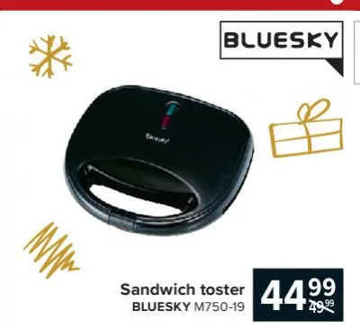 Cena produktu r贸偶ni si臋 w zale偶no艣ci od wybranego sklepu. Niestety nie posiadamy danych o aktualnych promocjach, jednak w艣r贸d archiwalnych ofert Sandwicher m750-19 Bluesky kosztuje od 39,99 z艂 do 44,99 z艂.