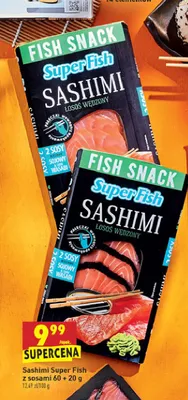 Cena produktu r贸偶ni si臋 w zale偶no艣ci od wybranego sklepu. Niestety nie posiadamy danych o aktualnych promocjach, jednak w艣r贸d archiwalnych ofert Sashimi z 艂ososia ze sk贸r膮 Superfish kosztuje od 9,99 z艂.