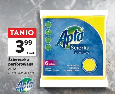 Cena produktu r贸偶ni si臋 w zale偶no艣ci od wybranego sklepu. Niestety nie posiadamy danych o aktualnych promocjach, jednak w艣r贸d archiwalnych ofert 艢cierka domowa Apta kosztuje od 3,49 z艂 do 3,99 z艂.
